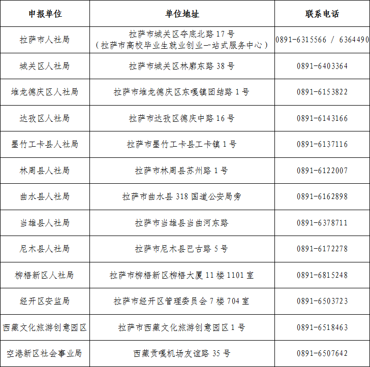 (2)区外就业创业高校毕业生高考时户籍属于自治区人民政府内地各办事处、西藏民族大学的,向拉萨市人社部门申报;