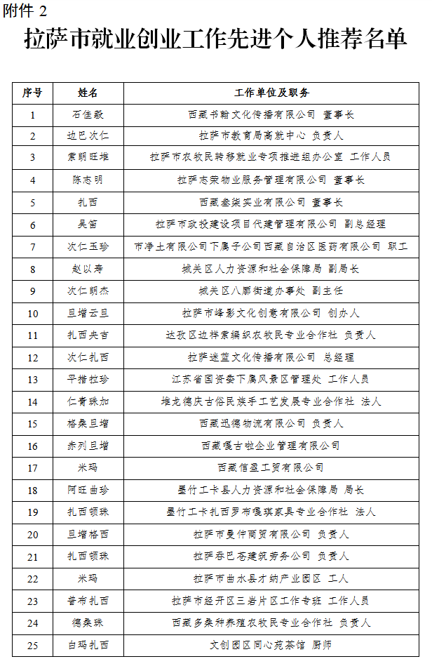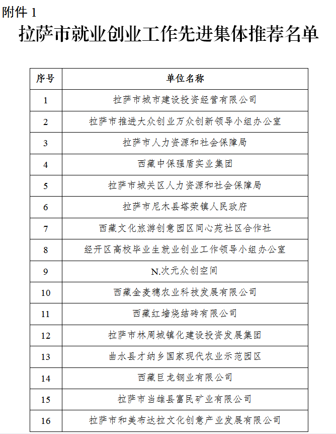 根据自治区就业创业工作评选表彰领导小组办公室《关于开展西藏就业创业工作先进集体和先进个人评选表彰活动的通知》(藏人社发〔2021〕67号)精神,经各县区、各部门民主推荐、材料审核、集体研究等程序,并报请市委、市政府同意,拟推荐拉萨市城市建设投资经营有限公司等16个先进集体,石佳毅等25名先进个人。现将拟推荐名单予以公示,公示时间为2021年10月19日至10月25日。