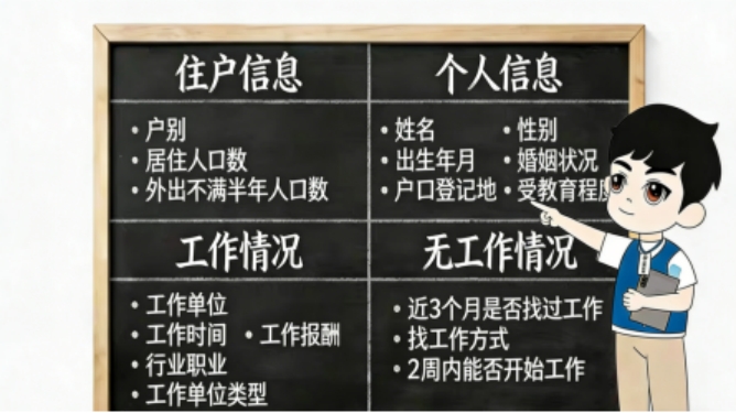 其实,劳动力调查问卷就像一份“就业情况清单”,主要了解您家中每位家庭成员的年龄、受教育程度等基本信息,也会询问到工作单位、所属行业、工作时长等就业相关情况。若您或家人目前暂无工作,我们也会了解近期的求职意向与相关打算。
