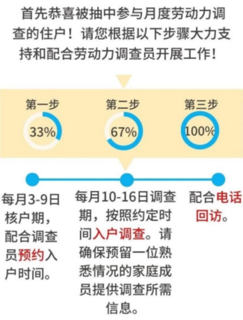 劳动力调查将严格按照《中华人民共和国统计法》相关规定,全流程加强对公民个人信息的保护。调查户所回答的个人信息将严格保密,仅用于汇总分析整体情况等统计目的,不向任何其他单位和个人提供。