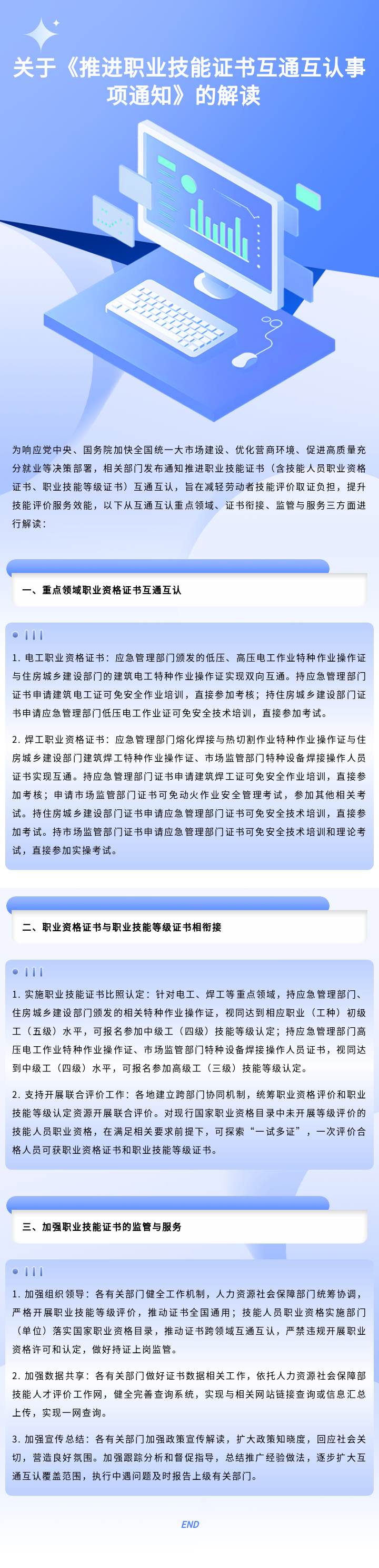 政策文件:人力资源社会保障部办公厅 住房城乡建设部办公厅 应急管理部办公厅 市场监管总局办公厅关于推进职业技能证书互通互认的通知